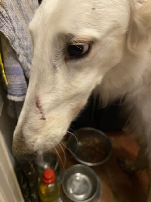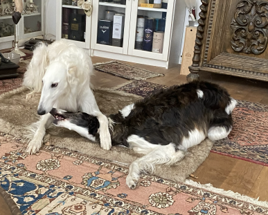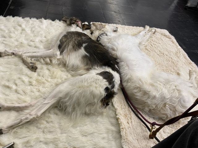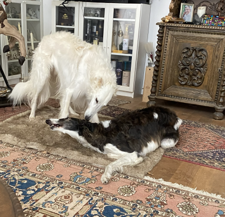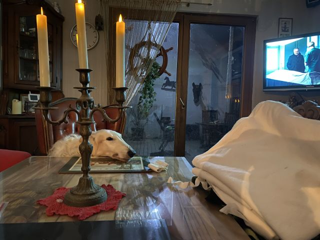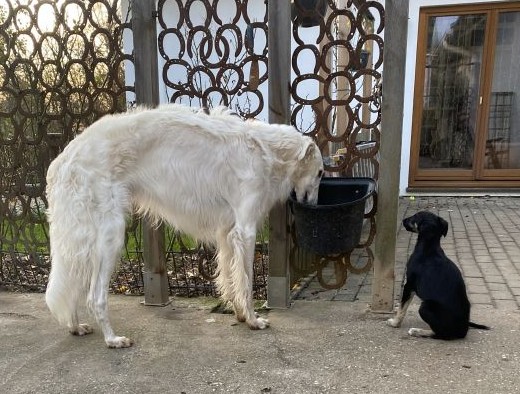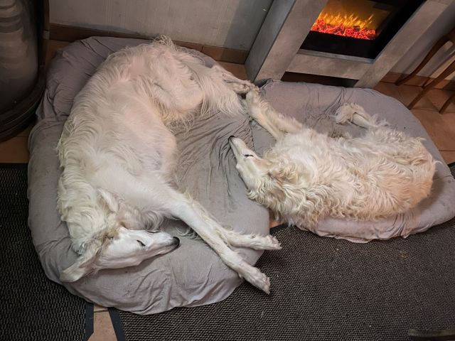 16.02.2025: Es gibt Tage, da ist man einfach müde! Der Streß fällt von einem ab, und zurück bleibt nur.... nichts! Man denkt! Der Tod gehört zum Leben, doch er reißt uns immer ein Stück aus dem Herzen! Die Barsois sind gefüttert, doch da Madame nicht alles aufgegessen hat, wollen die Herren ihren Napf auch noch ausschlecken!