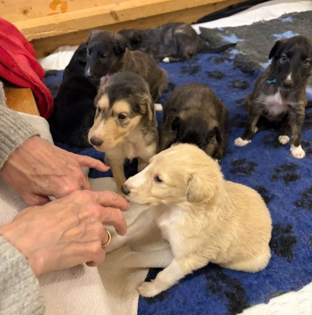 13.12.2025: Heute war wieder ein wichtiger Tag im Welpenleben: Wurfabnahme! Um 10:00h wollte Dietmar zur Wurfabnahme kommen. Das bedeutete für mich, alles muß schnell gehen, also KEINE Besen-und Schrubberspielchen mit den Welpen, was sie so gerne machen. Und wenn man schnell sein will, macht man Fehler! 1. Corund war nicht im Haus, 2. das Welpengehegetor war nur angelehnt. Und dann kam Corund aus dem Paddock zurück, das kleine Volk sah ihn und schwupps, alle durch das Tor: Corund begrüßen! Corund in voller Panik: "Was wollen die denn von mir? Nix wie weg!!!" Und dann ging die "Barsoischwanz-Jagd" los. Oh Heimat, bis ich die dann endlich alle wieder hatte!!! Der arme Corund! Er tat mir soooo leid! Doch das kommt davon, wenn man immer vor dem Zaun steht und die Kleiden anspielt.