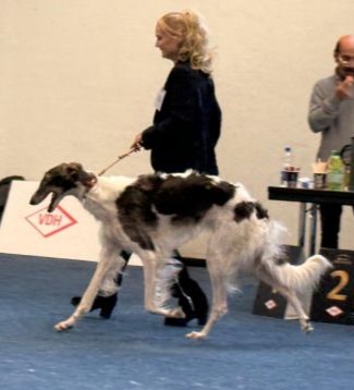 Joyces Ala, eine dunkle Schönheit, sehr elegant, behütet Corund! Das perfekte Paar: Black and white. Am 2. Tag hatte Corund begriffen, daß es alles gar nicht so schlimm ist, im Gegenteil, Frauchen hat ihn ganz dolle belohnt! Und so zeigte er sich von seiner besseren Seite und bekam sein erstes Jugend-VDH und CAC, Jugend-CACIB und wurde "Ortenau-Jugend-Sieger"! Hund auf Podest, Frauchen im Glück!