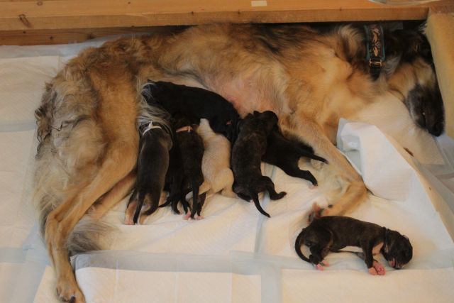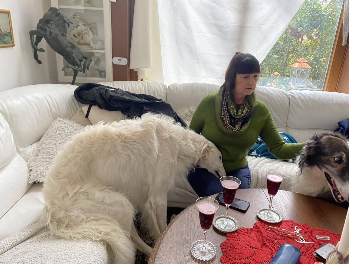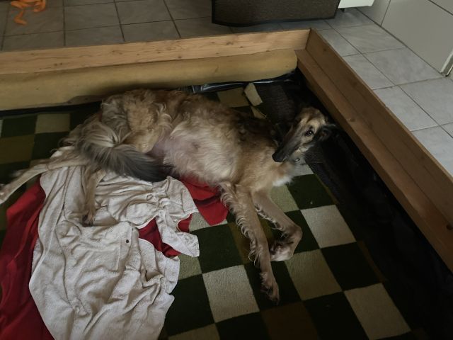 Als ich dann am nächsten Morgen früh nach Nitro schaute, da kam auch schon die erste Fruchtblase. Dann ging es Schlag auf Schlag! Ich rief schnell nach Kathie an, komm schnell, es geht schon los! Als Kathie, die wohl hergeflogen war, ankam, waren schon 5 Welpen auf der Welt! Nitro legte eine wohlverdiente Pause ein, und die 3 nächsten ließen sich ordentlich Zeit. Um 17:30h fuhren wir zur Röntgenkontrolle. So hat Nitro uns 8 ganz reizende Welpen geschenkt, 4 Rüden und 4 Hündinnen! Wir freuen uns riesig darüber. Eine absolut unkomplizierte Geburt, alle Welpen und Muttern sind wohl auf! 15.10.2025: Jürgen kommt, und wir bringen unser Auto in die Werkstatt! Jesses, da kommt mal wieder was auf uns zu! Dann Frühstücken wir alle gemeinsam. Später kamen unsere Nachbarn rüber, wir schnippelten gemeinsam die Zutaten für eine große Pizza und aßen gemütlich zu Abend. Es gab, wie immer, viel zu erzählen, wir hatten viel Spaß, selbst die Barsois brachten sich in Stellung und feierten mit.