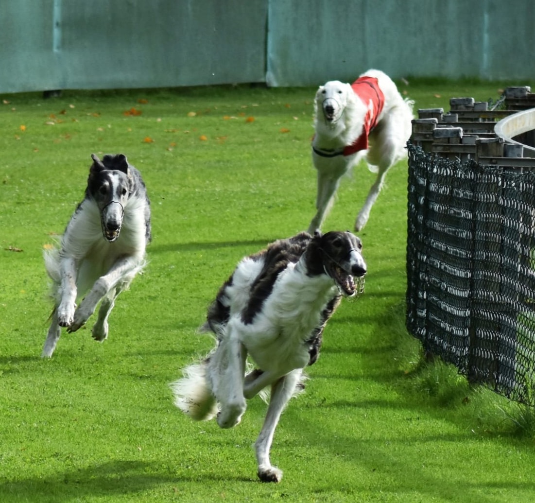 Auch Kathie war mit ihren IWs da. So durfte ich eine Hündin aus der Hand starten, die brauchen ja nicht in den Startkasten. Ich weiß nicht, was anstrengender ist, eine IW-Hündin zu starten oder Beryll beim coursing! Auch Elsa, die süße kleine IW-Jüngsthündin war mit! Meine Elsa!!!! Mit ihren 2 Geschwistern durfte sie auch ein paar Meter hinter dem "Hasi" herlaufen. So war es ein schöner, erfolgreicher Tag, unsere 7 Hunde und wir 2 Frauchens alle zufrieden.