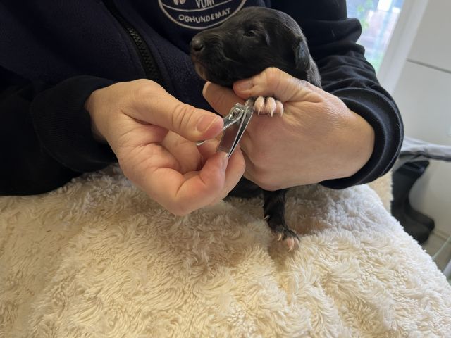 29.10.2025: Wenn Welpen da sind, gibt es nicht mehr viel anderes. Und so war heute das erste "Krallenschneiden" angesagt. Mama Nitro schien das anfangs nicht geheuer, doch wir rechnen fest damit, daß sie es uns danken wird!