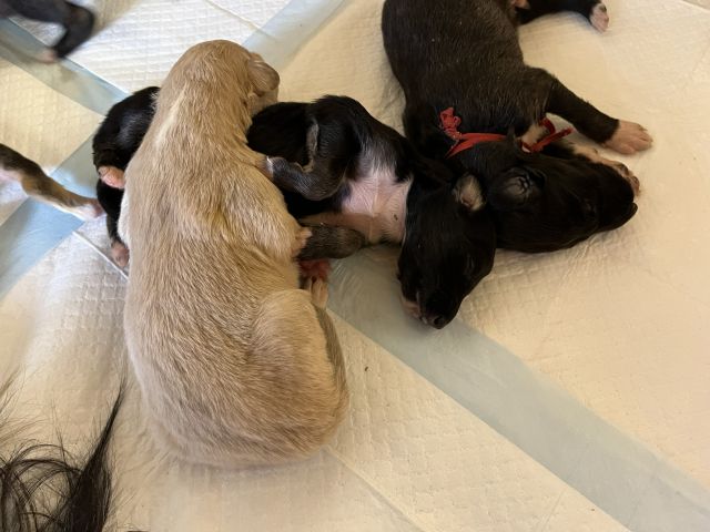 30.10.2025: Es ist schon richtig viel los in der Wurfkiste! Die 8 kleinen "Blinzler" tapsen schon ganz eifrig hin und her! Es ist eine Freude, ihnen zuzusehen. Sie nehmen gut zu, also ständig "Wäsche wechseln"!