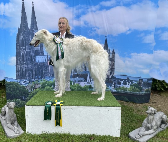 30.08.2025: Ach du liebe Güte, ich dachte, ich hätte Beryll für das S&L in Münster abgemeldet, doch 3 Tage vor der Ausstellung erfuhr ich - ganz zufällig - , daß er auf der alten mail-Adresse noch gemeldet war. So dachte ich mir: Wenn ich schon für ihn zahlen muß, dann kann ich ihn auch mitnehmen. Ich habe selten so enttäuschte Barsoigesichter gesehen, als die beiden merkten, daß es nicht zum Rennen ging! Corund war von den meinen als erster drann und erhielt ein V1, VDH. Ich freute mich, denn er gefiel der Richterin Frau Märki-Casanova sehr gut! Sie sagte zu mir: "Das Schleifchen bekommt er später!" Er mußte ja noch gegen die Gebrauchshundeklasse stechen, doch sie ging davon aus, einen der "üblichen" Gebrauchshunde zu sehen. Dann kam Beryll! Auch er bekam ein V1, VDH, und beide mußten gegeneinander stechen! Steffie half mir und nahm Beryll. Und das Glückskind erlief mit ihm das CAC!