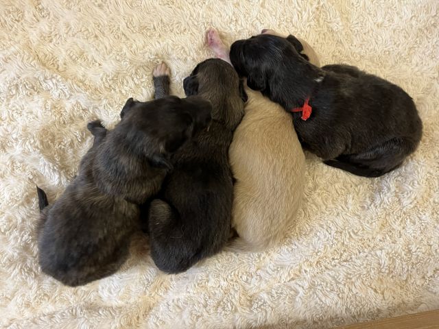 Hier sind die Rüden: Braunes Halsband, schwarzes Halsband, Champagner und Eldarit. Die beiden ersten suchen auch noch ihre endgültigen Namen! Wenn man die kleinen Racker jetzt so sieht, kann man sich kaum vorstellen, wie sich das Haarkleid von dem Rüden mit braunem Halsband und das der beiden Hündinnen entwickelt. Ich darf das mal an Hand der Schwester aus Nitros 1. Wurf zeigen, speziell an "Ella":