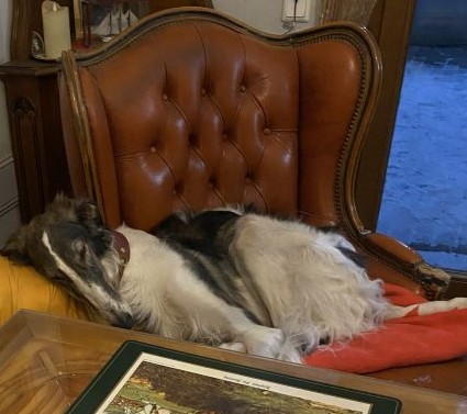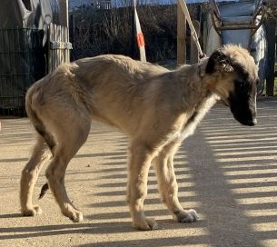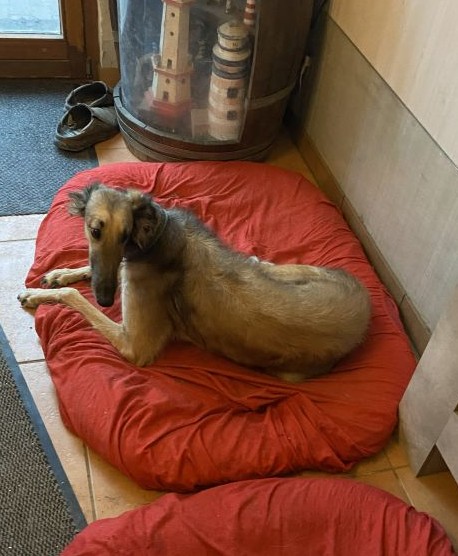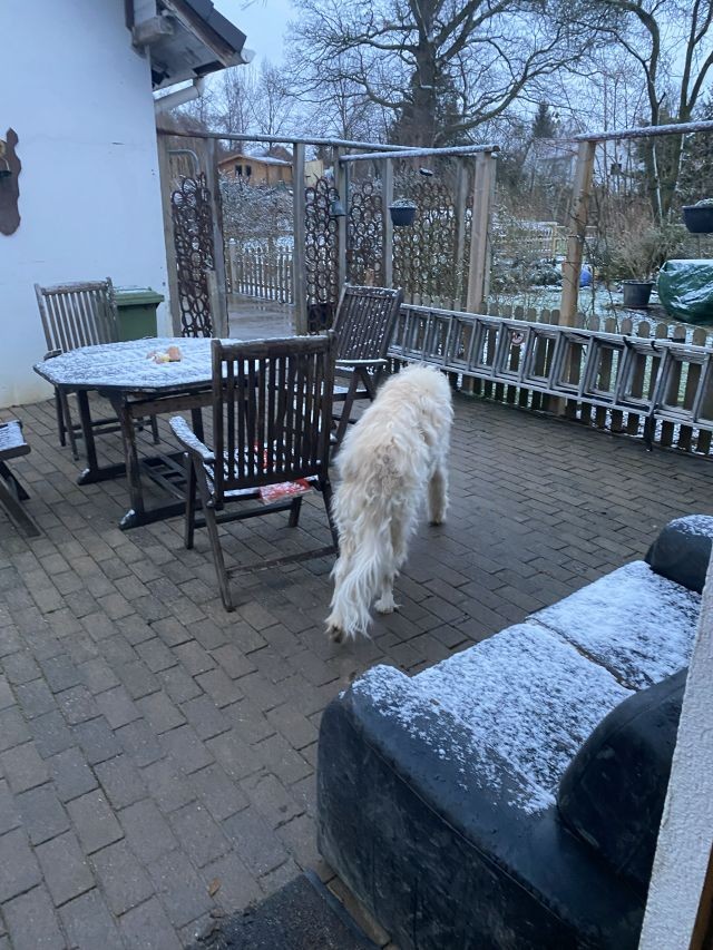 12.01.2026: Tauwetter! Der Boden ist noch hart gefroren, der Schnee geschmolzen, das Wasser kann nicht einsickern! Schlammschlacht für die Welpen, und den großen Barsois geht es auch nicht besser! Für mich bedeutet es: Putzen extrem!