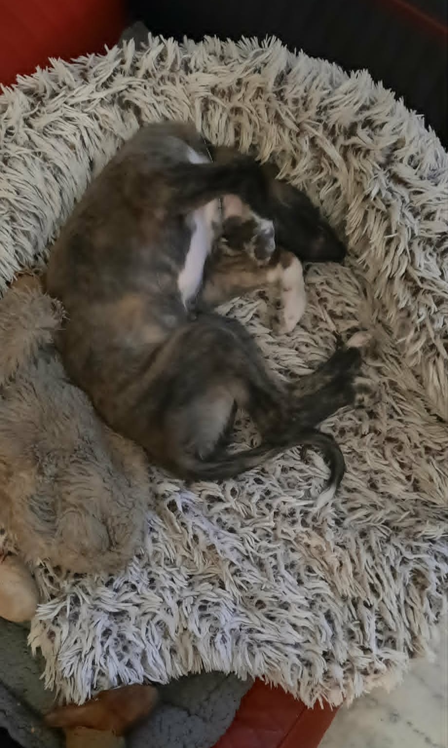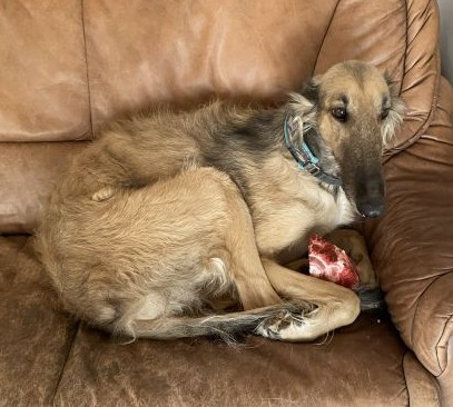 Auch Nitro bekommt ihren Knochen. Und nach dem Schmaus sitzen die Kleinen auf dem Sofa in der Sonne, zu süß!