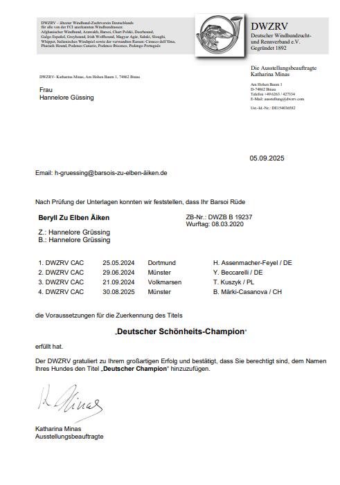 Deutscher Champion VDH, DWZRV-Leistungsurkunde Coursing, CACIL-Prüfung