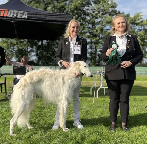 30.08.2025: Ach du liebe Güte, ich dachte, ich hätte Beryll für das S&L in Münster abgemeldet, doch 3 Tage vor der Ausstellung erfuhr ich - ganz zufällig - , daß er auf der alten mail-Adresse noch gemeldet war. So dachte ich mir: Wenn ich schon für ihn zahlen muß, dann kann ich ihn auch mitnehmen. Ich habe selten so enttäuschte Barsoigesichter gesehen, als die beiden merkten, daß es nicht zum Rennen ging! Corund war von den meinen als erster drann und erhielt ein V1, VDH. Ich freute mich, denn er gefiel der Richterin Frau Märki-Casanova sehr gut! Sie sagte zu mir: "Das Schleifchen bekommt er später!" Er mußte ja noch gegen die Gebrauchshundeklasse stechen, doch sie ging davon aus, einen der "üblichen" Gebrauchshunde zu sehen. Dann kam Beryll! Auch er bekam ein V1, VDH, und beide mußten gegeneinander stechen! Steffie half mir und nahm Beryll. Und das Glückskind erlief mit ihm das CAC!
