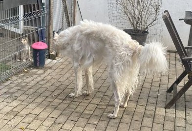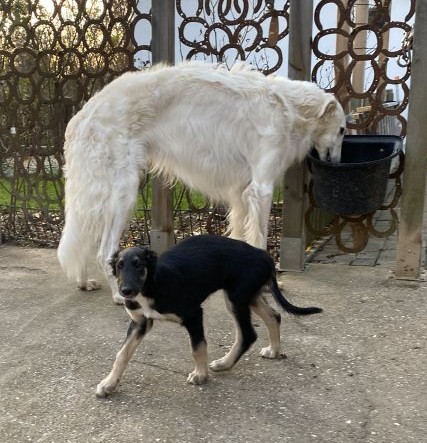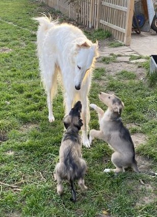13.12.2025: Heute war wieder ein wichtiger Tag im Welpenleben: Wurfabnahme! Um 10:00h wollte Dietmar zur Wurfabnahme kommen. Das bedeutete für mich, alles muß schnell gehen, also KEINE Besen-und Schrubberspielchen mit den Welpen, was sie so gerne machen. Und wenn man schnell sein will, macht man Fehler! 1. Corund war nicht im Haus, 2. das Welpengehegetor war nur angelehnt. Und dann kam Corund aus dem Paddock zurück, das kleine Volk sah ihn und schwupps, alle durch das Tor: Corund begrüßen! Corund in voller Panik: "Was wollen die denn von mir? Nix wie weg!!!" Und dann ging die "Barsoischwanz-Jagd" los. Oh Heimat, bis ich die dann endlich alle wieder hatte!!! Der arme Corund! Er tat mir soooo leid! Doch das kommt davon, wenn man immer vor dem Zaun steht und die Kleiden anspielt.