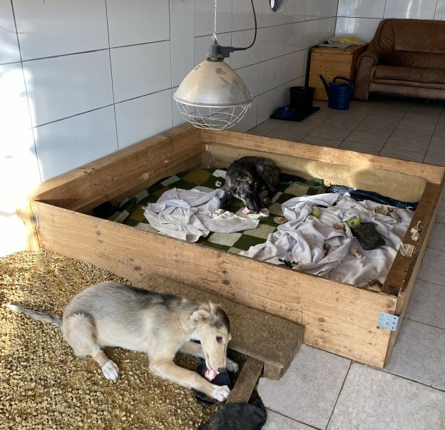 12.01.2026: Tauwetter! Der Boden ist noch hart gefroren, der Schnee geschmolzen, das Wasser kann nicht einsickern! Schlammschlacht für die Welpen, und den großen Barsois geht es auch nicht besser! Für mich bedeutet es: Putzen extrem!